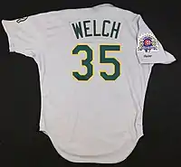 A two-time All-Star (1980 and 1990), Welch won 14 or more games in eight years, with a career-high 27 in 1990. He received the Cy Young Award that season, and was considered in the MVP vote. His 27 wins were the most by any pitcher since Steve Carlton also won 27 in 1972, and as of 2023 stands as the last time a pitcher has won 25 or more games in a season (the closest anyone has come to that mark since is 24, accomplished by John Smoltz in 1996, Randy Johnson in 2002, and Justin Verlander in 2011). The last pitcher to win more games in a season was Denny McLain, with 31 wins in 1968.[4] Nineteen of his wins were saved by Dennis Eckersley, which remains a record.[5]