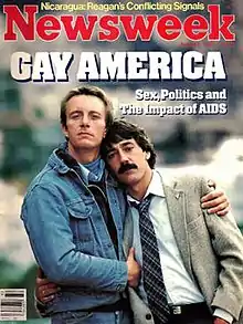 ![]() Bobbi Campbell (left), with his lover Bobby Hilliard, on the cover of Newsweek, August 8, 1983 | |