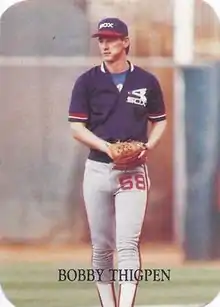 Robert Thomas "Bobby" Thigpen (born July 17, 1963) is an American former relief pitcher in Major League Baseball. He is noted for setting the major league record of 57 saves during the 1990 season, which has since been broken by former Los Angeles Angels of Anaheim pitcher Francisco Rodríguez.[1] He is the former pitching coach of the Winston-Salem Dash. He is also the former bullpen coach for the Chicago White Sox.