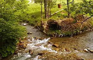 Above its water source there is the riverhead between Lašva river and Velika Usora (i.e. Bosna river) and Vrbanja river and Ugar (i.e. Vrbas). It is conducting the waters from numerous creeks and the strongest tributaries are (on right) Ljeskovac and Duboki and Novački potok (Deep and Novak's stream, on left)[2][3]. To its mouth in Kruševo Brdo, it is longer than Vrbanja river. It is (probably) reason for different estimations of Vrbanja's length (70-85,5 km).[3][4][5]