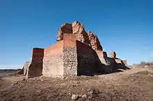 Little is known about the appearance of the fortress at the time of the Teutonic Knights or later. The object was probably two-winged (other sources say that it was a square), surrounded by walls and a moat, with one gate and a cylindrical tower. The only remains of the past splendor of the castle are elements of fortified walls and a sentry tower.[5]