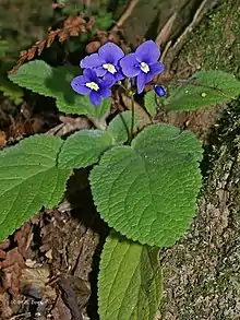 Boea hygroscopica (known as rock violet) is one of 15 species of flowering plant of the Boea genus in the gesneriad family.[2] It is considered a 'resurrection plant' because of its ability to withstand virtually total water loss. Detached leaves of B. hydroscopica can withstand desiccation by increasing the small amount of constitutive glutathione by up to 50 times.[3]