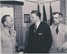 Just as he was truly hitting the stride of his career, having changed fighting platforms from horses, to tanks, to helicopters in the span of fewer than three decades, MG Cairns was killed immediately after take-off while flying solo in his Bell H-13 Sioux helicopter to view a firepower demonstration. Although erroneously reported to have been due to carburetor icing in W.E.B. Griffin's The Majors, a fiction perpetuated to this day, he had in fact hit a wire that had been hung unmarked between two trees.[8] He died instantly, cutting short a brilliant military career. He was only 48 years old. Credit for the development of Air Cavalry would posthumously go to others, especially to his old World War II commander, Gen. Hamilton Howze—who chaired the Howze Board, also known as the Tactical Mobility Requirements Board, commissioned by then Secretary of Defense Robert McNamara—credit for which Cairns would not have begrudged him—they had known each other since 1928 at West Point.[9]