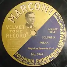 Bohumir Kryl (originally Bohumil Krill, also Bohumír Kryl) was born on May 3, 1875, at Hořice 230, Bohemia, Austria-Hungary.[2][3] He was baptized Catholic 7 days later.[4] His first instrument was the violin, which he studied at age 10.[3] While attending school in Hořice he was classmates with Jan Kubelík, with whom he maintained correspondence.[5] He spent time performing both the violin and the cornet for a circus band in Prague.[3][6] He also performed as an aerialist acrobat with the Rentz Circus in Germany,[7] but an accident in 1886 ended this line of work.[2] His father was a sculptor, and Bohumir also studied this art.[2] He emigrated to the United States in 1889,[3][8] paying the fare in part by performing with the ship's orchestra.[9] Moving to Chicago, English sculptor H.R. Saunders furthered his profession in that area. Bohumir followed Saunders to Indianapolis[1] and was soon employed, along with his brother,[10] as a sculptor by General Lew Wallace and also working on the Soldiers' and Sailors' Monument.[2] Simultaneously he joined the When Clothing Company Band, playing the cornet[9] and soloing on this instrument.[2] Before long he was hired by John Philip Sousa, but was fired in 1898 by Sousa because he copied some of the band's music for his own personal use.[11] He then joined Thomas Preston Brooke's Chicago Marine Band, where he spent the next two years.[2] During this time he studied with Weldon of Chicago's Second Regiment Band.[2] In 1901 he spent some time with Phinney's United States Band,[12] but he joined the Duss Band permanently that year.[2] This group was based at Madison Square Garden, at $800 per-month and became its assistant conductor in 1903.[9] This band, led by Frederick Innes, was not as well known, but he was hired as soloist, and the heavy touring schedule and two solos per concert gained him wide exposure.[2] His solos would result in requests for multiple encores.[13] Studying bandleaders Creatore and Vessela, he adopted a wild 'lionesque' hairstyle that became his trademark.[2][14] He became acquainted with Joseph Jiran, who owned a Czechoslovak music store in Chicago. With Jiran's encouragement, he formed his own band in 1906[2] styled as Kryl's Bohemian Band by 1910[3] with the Cimera brothers.[15] This group worked for Columbia, Victor, and Zonophone, recording works by such composers as Smetana, Dvorak, and Safranek.[3] He earned the distinction of the first Czech musician to record on phonograph cylinders.[1] Kryl's older brother František Xaverský (Frank) Kryl became a band-leader in Chicago.[16] An even older brother Jan Křtitel (John) was president of the Pilsen Foundry & Iron Works there.[17]