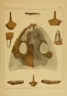 | The crushed skull of Boii, showing impressions (grey) and the underside of preserved bones (yellow) illustrated along with other tetrapod fragments by Frič (1883) | |