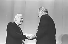 Jones (left) shaking hands with US President Lyndon B. Johnson in December 1968