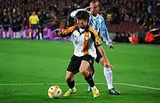 On 16 September 2007 (at 17 years and 19 days), Bojan made his official debut for Barcelona against Osasuna, replacing Giovani dos Santos in the 78th minute[4][8] and breaking Lionel Messi's record of the youngest Barcelona player to feature in a La Liga match.[9] Three days later, he made his UEFA Champions League debut against Lyon, coming on at the 88th minute for Messi. He was, at the time, the youngest Barcelona player ever to feature in a Champions League game, at 17 years and 22 days.[10] He made his second Champions League appearance on 2 October, coming on at the 81st minute for Ronaldinho against VfB Stuttgart. On 20 October 2007 (at 17 years and 53 days), Bojan made his first league start for Barcelona away to Villarreal and scored in the 25th minute. It was his first goal for the club's first team and it made him the youngest ever goalscorer for Barcelona in a league match.[11][12]