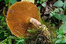 Boletinellus monticola has a yellow-brown cap with a yellow or orange fertile layer. The stalk extends a few centimeters from the ground and is commonly brown. The fertile layer is made up of large and yellow pores and tubes. B. monticola is also known to produce brown sclerotia in soil providing the ability for the fungus to survive under extreme environmental conditions. The flesh of the bolete is soft and often moist or even wet due to its favored climate of warm tropical areas. This species also produces highly differentiated rhizomorphs with brown dolipore hyphae.[5] B. monticola bruises blue then fades to reddish brown then to dark brown.[6]