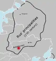 According to historians, Bolokhov was located in the upper reaches of the Southern Bug, in the basins of the Horyn River with the Sluch tributary and the Teteriv River. This follows the mention of it in the Galician-Volhynian Chronicle of the 13th century.[4] The very first mention is associated with the year 1150, when Volodymyrko Volodarovych, prince of Galicia, went from Galicia to Kyiv through Bolokhov. The second reference dates back to 1170, when Mstislav II, through Bolokhov, fled from Kyiv to Volodymyr-Volynskyi. The third reference is in 1231, the fourth, about the attack of Daniel of Galicia, in 1241, and finally the last in 1257.[5] The Bolokhovs were allied with Rostislav Mikhailovich and they saw action when the latter besieged Bakota.[6] An account described the capture of the princes of Bolokhov by Volodymyrko after the attack on Daniel's lands.[3]