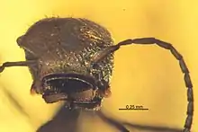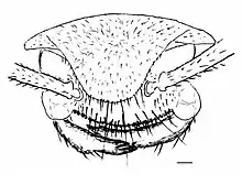 The head is small and wider than long, with a generally triangular outline in dorsal view.[1] The upper surface is thickened into a shield with a curved and raised profile and two elongated processes extend out and slightly forward from the rear of the head.[1] The eyes are either reduced to such a degree that they are not visible, or are possibly lost all together, and no ocelli are visible.[1] The clypeus is small and strongly curved, with the front margin that faces the inner sides of the mandibles covered in 25, 0.01 mm (0.00039 in) long, peg-like setae. Each mandible is curved almost 90˚ with the bases covered by the edges of the clypeus lobes. On the mandible's ends are two teeth, a smaller sub-apical one and a larger apical one with a groove that likely matches the position of the opposite mandible placement when they are closed. The antennae are distinctly 11-segmented, with a curved scape that just reaches the rear margin of the head capsule when reclined.[1]