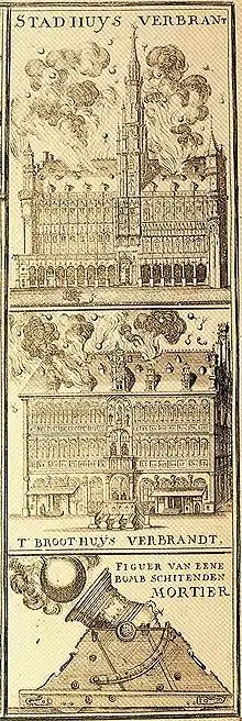 ![]() A contemporary map and illustration of the 1695 bombardment of Brussels and the subsequent fire. The white areas in the centre are the areas destroyed. | |||||