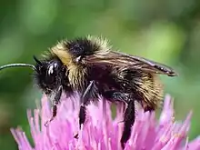 The bumblebee is of medium length, the queen having an average length of 18 mm (0.7 in), and the male 15 mm (0.6 in).[3] The fur of the queen is quite thin on the dorsal (upper) side. The collar, and in some cases the top of the head, is orange-yellow, while the terga (abdominal segments) 3–5 have yellow sides with a black centre; the rest of the body is black. The fur of the male is more variable: A pale form exists, with a broad, pale yellow collar, yellow hairs on top of the head, pale hairs on the sides of the otherwise black first tergite, a yellow line along the posterior rim, terga 3–6 pale yellow, usually with a black, thin, centre line. As for the queen, the rest of the body is black. The dark form is entirely black except for a thin, diffuse band on the collar and yellow hairs on the sides of terga 4–6. Intermediate forms exist. Both queens and males can be melanistic. In western Scotland, the subspecies B. c. swynnertoni is found, with a queen with an almost entirely pale yellow thorax, yellow hairs on terga 1 and 2, and a yellow tail. The male has more black on the thorax, but a lot of yellow on the abdomen.[4]