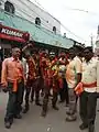 Potharaju always dances in front of the Palaharam Bandi, i.e., the procession. He is considered the initiator of the festivities and the protector of the community. He leads the female dancers who are under the spell of the Mother Goddess (known as shigam) to the temple, with lashing whips and emerald neem leaves (margosa) tied around their waists, accompanied by trumpets and drums.[6]