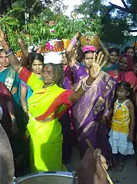 Bonalu( Telugu: బోనాలు) is a traditional Hindu festival centered on the Goddess Mahakali from Telangana.[1] This festival is celebrated annually in the twin cities of Hyderabad and Secunderabad, as well as in other parts of the state.[2] It is celebrated in the month of Ashada Masam, which is around July and/or August. Special "poojas" (worship/ ceremonies) are performed for Yellamma (one of the many regional forms of Mahakali) on the first and last day of the festival.[3] The festival is also considered a thanksgiving to the Goddess for fulfillment of vows.[4]