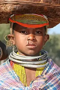 Bonda women have their heads shaved and adorned with two types of headbands, called turuba and lobeda. The turuba is made of grass and the lobeda made of beads. Worn together the turuba secures the lobeda by preventing the beaded headband from slipping off the woman's head. Bonda women wear metal bands adorning their necks, which are called khagla and are made from aluminum. Including the bands around their neck, necklaces made of beads are also worn, these are called Mali. Due to the culture surrounding their ringa cloth which covers the waist down, the khagla and Mali act as a sort of clothing for the upper body of the women. Both men and women of the tribe wear earrings called limbi made of brass, and rings on their fingers called orti made of aluminum. For bachelors or newly married men, it is customary to wear their own set of ornaments. Beginning at the ages of eight or nine, males will adorn their bodies with headbands called ornaghboh, bangles called sungrai, necklaces called thangimali, earrings called unsurul, and rings called sanbah. Once married, men typically do not continue to adorn their bodies with more ornaments.[12]