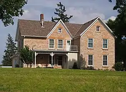 The Bonde Farmhouse is located off County Road 27 and Minnesota State Highway 246, just outside the town of Nerstrand. The building's siting on a hilltop location, alongside its stone masonry construction, make it a focal point for the farmstead and landmark in the area. The 2+1⁄2-story house is constructed of Nerstrand and Faribault limestone and its two sections form an L-shape. All windows and door opening on the west (front) side of the north ell are located below the central cabled roof while wider spaces are located between other openings. The two-over-two windows have stone sills and lintels. Small, slightly arched windows are centered in the gable ends. The front porch features turned posts, turned brackets and spindles along the porch frieze and is topped by a metal railing; it extends across the west side of the north ell.[3] In 1960 a basement garage and 1-story addition were added to the rear of the building.