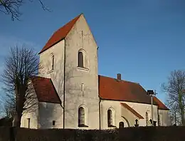 The church was probably built during the 12th century and altered in the 13th century. The original church seems to have had some kind of westwork, probably housing the baptismal font, and a choir without an apse. The interior vaults were added during the first half of the 15th century. At the same time, the nave was slightly enlarged. A church porch was another late medieval addition, which however was removed during the 19th century. In the 19th century, a tower was added to the church but destroyed by lightning in 1916. The presently visible tower was thus built during the 20th century. The oldest of the church fittings is the larger of the two church bells, made in 1536. The pulpit is from 1763, and some of the church silver from 1749.[1][2]