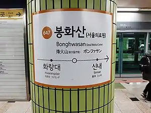 Bonghwasan Station is a railway station in Jungnang-gu, Seoul. It was the eastern terminus of Seoul Subway Line 6 until December 21, 2019, though many eastbound trains still terminate here, as Sinnae station is only allowed to accommodate 1 train at a time as the Line 6 station only has one track and one platform, but it will be expanded to 2 tracks and 2 platforms in the future.