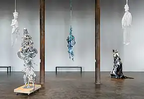 Collura's exhibition, "Mutable Bodies" (Hallwalls, 2022) juxtaposed sewn, cast and carved works (some, like Rebuke: Two Months Until Fifty, 2020, employing all three methods) that shared formal properties, shapes, and modes of expression: for example, the textile work Guardian Blue (2018)—a vertical tangle of joined, repurposed quilted fabric whose shimmering, colored surfaces belied its hung, world-weary form—and Matriarch/HeavyMetal/Jesus (2018), a solid, undulating and ascending silver sculpture.[13][31]