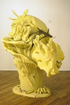 Between 2000–07, in exhibitions such as "In the Gutter" (Lehmann Maupin, 2000) and "Rebel Angel" (Susan Inglett, 2003), Collura experimented with increasingly abstracted, monochrome sculptures.[5][40][4][30] They melded barely recognizable human and animal forms, branches, classical drapery and commedia dell'arte costuming, seemingly embattled to materialize out of central, amorphous masses (e.g., Chain Reaction, 1999).[5][41][6][4] Reviewers characterized these works as "dramatically abject"[6] portrayals of ecstasy or distress that suggested souls entrapped in terrestrial chaos or angels expelled into corporeality as monsters and twisted freaks of nature.[4][30] New York Times critic Holland Cotter likened them to "multi-vehicle collisions … Baroque sculpture, Disney animation and Butler's Lives of the Saints seem to have met at meltdown speed, leaving stray limbs and maimed myths protruding from the wreckage."[35] Guardian (2003) portrayed a 21st-century Madonna with a clown's nose and an erupting hand, while Death of a Virgin (2006–11) depicted a large-eared, shattered figure on its back atop a vertical mass, as if after a great fall.[29][30]