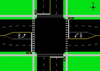 A traffic intersection. The four incoming and four outgoing pairs of through lanes, two turn pockets, and four crosswalk corners can be represented as a set of 14 vertices on the spine of a book embedding, with edges representing connections between these points.