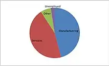 Unlike the 1881 Census data[10] agricultural employment is now barely existent in the village due to the fact that food is now transported nationwide rather than just locally and the UK imports much of its produce, furthermore advancement in technology means less staff are required. Increasing service and manufacturing employment makes up 93.3% of Boraston's occupational categories. The increase in manufacturing reflects a more industrialised economy, despite the 1811 Census data being recorded in the time of Industrial Revolution; Boraston had little involvement as a small remote community with a small work force. An increase in services as an occupational category also reflects the UK's shift from primary production to having an increased tertiary sector of the economy.