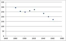 Between 1914 and 1918 population in the UK declined as a result of the First World War; however Boraston bucked this trend instead showing a slight increase in population. However, as more men (approximately 5 million)[9] were called up to serve in the forces for The Second World War (1939–1945), Boraston saw an incline in numbers, a possible reason for this could be the intake of evacuees. Unlike the rest of the country Boraston also failed to see an incline in population as a result of the post-war 'baby boom', whereby nationally birth rates increased in the period from 1946 to 1974.
