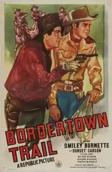Bordertown Trail is a 1944 American Western film directed by Lesley Selander and written by Robert Creighton Williams and Jesse Duffy. The film stars Smiley Burnette, Sunset Carson, Weldon Heyburn, Addison Richards, Francis McDonald and Jack Luden. The film was released on August 11, 1944, by Republic Pictures.[1][2][3]