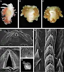 - ↑ Korshunova, T.; Martynov, A.; Bakken, T.; Evertsen, J.; Fletcher, K.; Mudianta, W.; Saito, H.; Lundin, K.; Schrödl, M.; Picton, B. (2017). Polyphyly of the traditional family Flabellinidae affects a major group of Nudibranchia: aeolidacean taxonomic reassessment with descriptions of several new families, genera, and species (Mollusca, Gastropoda). ZooKeys. 717: 1-139.