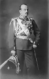 1911 was a busy year for the grand duke. He was made colonel and in April he represented Russia at the Turin World Fair and the Fine Arts Exhibition in Rome during the celebrations for the 50th anniversary of Italy's unification.[22] On 22 June 1911, he represented his cousin Tsar Nicholas II at the coronation of Britain's King George V in Westminster Abbey.[22] In November the same year, he was Russia's emissary at the coronation of Vajiravudh the King of Siam.[24] On his way back to Europe, he visited Egypt and Greece.[15] Between 1910 and 1914, he wore the uniform of colonel of His Imperial Highness the Tsarevich Atamansky Guards Cossack Regiment. In 1914, he became a major general.[25]