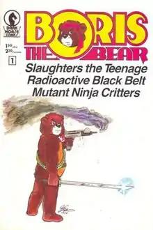 Boris the Bear is a fictional comic book character featured in several comic book titles published between 1986 and 2008.[1] The series began as a response to the popularity of the wave of anthropomorphic animal titles that began with the publishing of Teenage Mutant Ninja Turtles in 1984.[2] That title, itself a parody of popular comic books at the time such as Daredevil, inspired numerous knock-offs and parodies like Adolescent Radioactive Black Belt Hamsters, Pre-Teen Dirty-Gene Kung-Fu Kangaroos, Mildy Microwaved Pre-Pubescent Kung Fu Gophers and Geriatric Gangrene Jujitsu Gerbils which led to what many refer to as the Black-and-White Boom of the mid-1980s. The Boris character started as bear who was tired of these comic books and decides to kill them in a hyper-violent style reminiscent of 1980s films such as Rambo. After the first issue, Boris the Bear continued to fight parodies of the Transformers, Marvel Comics, Swamp Thing, and Elfquest before moving on to more character-driven stories.