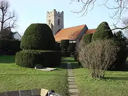 The church (dedication unknown) is a small building of stone; the nave may date to the 11th century. Later renovations have resulted in the mainly perpendicular style of the mid-14th to 16th centuries, still visible in the chancel and the western tower.[3] The church as it now stands consists of chancel, nave, south porch and a crenellated western tower containing three bells, two of which were cast by Alfred Bowell of Ipswich in 1926, and one from 1574 cast by S II Tonni. They hang in their original oak frame with evidence a fourth bell may once have been present. There is a topiary walk leading to the porch, with bushes once shaped like Indian chess pieces. The path was once flagstones; however, in 2017 a wheelchair-friendly brick path was installed with side lights.[3] It is designated by English Heritage as a Grade I listed building.[4] Grade I is the highest of the three grades of listing, granted to buildings that "are of exceptional interest, sometimes considered to be internationally important".[5]