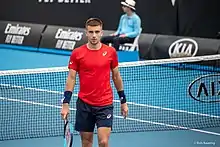 Borna Ćorić (Croatian pronunciation: [bôːrna tɕǒːritɕ];[4][5][6] born 14 November 1996) is a Croatian professional tennis player.[7] On 5 November 2018, he reached his best singles ranking of world No. 12. In 2022, Ćorić became the lowest-ranked champion in Masters 1000 history when he won the Cincinnati title.[8] He is currently the No. 1 Croatian player.[9]