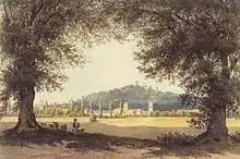 The settlement arose in the late 12th century, it was first mentioned in a 1304 deed. The Bornstedt manor comprised the present-day gardens of Sanssouci, it was acquired by the "Great Elector" Frederick William of Brandenburg in 1664. The Prussian king Frederick William I ceded the estates to the Potsdam orphanage; his son King Frederick the Great had to pay a significant compensation before building Sanssouci Palace from 1744 onwards. He had a water basin erected atop a hill north of the park in order to supply the fountain system, which ultimately failed due to lack of expertise. Frederick had the reservoir decorated with artificial ruins and the hill was called Ruinenberg.