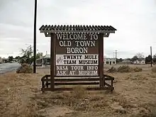 Boron (formerly Amargo, Baker, Borate, and Kern)[4] is a census-designated place (CDP) in Kern County, California, United States. Boron is 15 miles (24 km) southwest of Red Rock Mountain at an elevation of 2,467 feet (752 m).[4] The population was 2,086 at the 2020 census, up from 2,025 at the 2000 census. Boron is named after the element boron and is the site of the world's largest source of the boron compound boric acid.