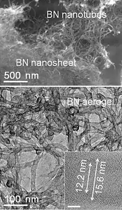 Boron nitride aerogel is an aerogel made of highly porous boron nitride (BN). It typically consists of a mixture of deformed boron nitride nanotubes and nanosheets. It can have a density as low as 0.6 mg/cm3 and a specific surface area as high as 1050 m2/g, and therefore has potential applications as an absorbent, catalyst support and gas storage medium. BN aerogels are highly hydrophobic and can absorb up to 160 times their mass in oil. They are resistant to oxidation in air at temperatures up to 1200 °C, and hence can be reused after the absorbed oil is burned out by flame. BN aerogels can be prepared by template-assisted chemical vapor deposition at a temperature ~900 °C using borazine as the feed gas.[1] Alternatively it can be produced by ball milling h-BN powder, ultrasonically dispersing it in water, and freeze-drying the dispersion.[2]