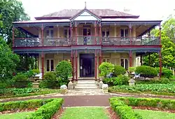 The house is set in a formal Victorian garden setting, with a circular carriage drive or loop immediately south of the main front door, large lawn areas and trees and shrubs set off to both sides and the rear. Large old tree specimens of evergreen magnolia (M.grandiflora), camphor laurel (Cinnamomum camphora) flank it to the southeast, and a pair of symmetrically placed lemon scented gums (Corymbia maculata) frame the house's front gates to Military Road.[14][1]