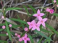 Boronia chartacea is a shrub that grows to a height of 0.4–2.7 m (1–9 ft) with young branches that are hairy. The leaves are papery, elliptic to oblong, 20–50 mm (0.8–2 in) long and 2–4 mm (0.08–0.2 in) wide on a petiole 1–2 mm (0.04–0.08 in) long. The leaves are covered with warty glands and the edges are turned downwards or rolled under. The flowers are bright pink and are arranged singly or in groups of up to three in leaf axils, each flower on a stalk 1–8 mm (0.04–0.3 in) long. The four sepals are egg-shaped, 2–3.5 mm (0.079–0.14 in) long, 1.5–2.5 mm (0.059–0.098 in) wide and hairy on the lower side. The four petals are 7–9 mm (0.28–0.35 in) long. Flowering occurs from August to October and the fruit is a smooth capsule.[2][3][4]