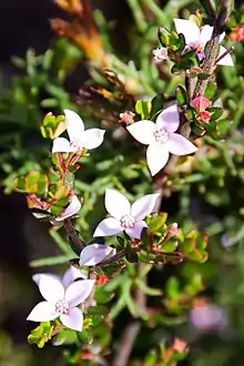 Boronia edwardsii, commonly known as island boronia,[2] is a plant in the citrus family, Rutaceae and is endemic to South Australia. It is a small, erect shrub with trifoliate leaves and pink or white flowers with four petals and eight stamens. It is common on Kangaroo Island but rare on the mainland.