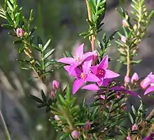 Boronia granitica, commonly known as granite boronia,[2] is a plant in the citrus family, Rutaceae and is endemic to a small area of eastern Australia. It is an erect shrub with many branches, compound leaves and pink, four-petalled flowers.