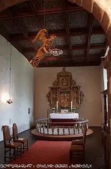 The pulpit is from about 1600. The church has a Baroque altarpiece carved of wood by Abel Schrøder in 1665. The side panels show scenes from the life of Jesus, the Annunciation, Nativity, Jesus' baptism and prayer in Gethsemane. The pulpit is Renaissance, with pictorial representations of the virtues. The church has two bells which are both were recast.