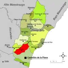 Borriol is situated in a valley between the Desert de les Palmes and the Serra de Borriol mountains, in the southwest of the comarca of Plana Alta.[6] The municipality of Borriol borders the municipalities of Sant Joan de Moró, Vilafamés, La Pobla Tornesa, L'Alcora, Benicàssim and Castellón de la Plana, all belonging to the Province of Castellón. The proximity to the provincial capital of Castellón de la Plana makes Borriol a dynamic town with a growing economy. The local landscape is typical of the Mediterranean, with dry fields with olive and carob trees,[7] next to the mountains of the Paraje Natural del Desierto de las Palmas. Borril is accessed by the CV-151 and CV-10 roads.