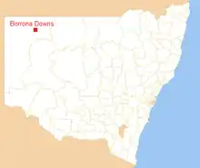 Borrona Downs Station is a cattle station near White Cliffs in far western New South Wales, Australia.[1][2][3] It is about halfway between Milparinka, around 100 km to the West, and Wanaaring, around 100 km to the East, as the crow flies.[2]