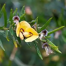 Bossiaea rosmarinifolia, commonly known as Grampians bossiaea,[2] is a species of flowering plant in the family Fabaceae and is endemic to the Grampians in Victoria. It is an erect or spreading shrub with linear leaves and yellow and red flowers.