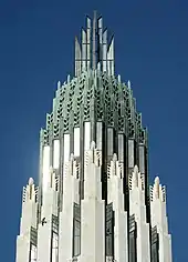 The original building consisted of a semicircular auditorium, a soaring 225-foot (68.5 m) tower, and a wing containing class rooms. The soaring straight lines of the tower provide physical, visual, and philosophical linkage to the Gothic Cathedrals of past ages as well as allowing the designers to indulge in the Art Deco celebration of the vertical.