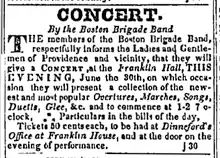 The band often performed at appearances of the Boston Light Infantry.[4] "The band uniform ... was especially neat and attractive and bore a marked difference to any then worn by the militia. The coat was blue, of the same style and pattern as worn by the officers of the U.S. army, with three rows of bell buttons on the front, and was further set off by a gold-laced collar."[4]