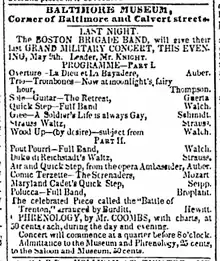 Leaders of the Brigade Band included: Asa Fillebrown (1821–1826, 1828–1835);[5][6] James Kendall (1826–1827);[5] Abel F. Knight (1836–1844);[5] J.H. Seipp (1844–1848);[5] Patrick S. Gilmore (1852, c. 1859);[7] and E.H. Weston (c. 1858).[8]