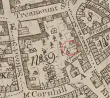 "Opened in 1635, the Boston Gaol served as Massachusetts' sole prison for eighteen years. ... As settlers fanned out into the wilderness, organizing new townships as they went, local facilities for incarceration sprang up elsewhere."[2] The Boston Gaol sat on Prison Lane (1634–1708), which became later known as Queen Street (1708–1788), and then Court Street (from 1788).[3] Around 1689, "the old stone gaol on Prison Lane [had] ... outer walls ... of stone three feet thick, its unglazed windows barred with iron, 'the cells partitioned off with plank, the doors covered with iron spikes, the passage-ways like the dark valley of the shadow of death.'"[4] In 1704, a new building replaced the old on the same site.[5]