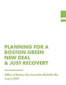 - 1 2 3 Gavin, Christopher (August 24, 2020). "What to know about Michelle Wu's 'Green New Deal & Just Recovery' for Boston". www.boston.com. Archived from the original on September 15, 2021. Retrieved September 15, 2021.