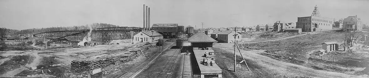 A view of Boswell's mining operation in its prime: The coal tipple can be seen crossing the left side of the photograph. Near the center-left is the steam engine that pulled the cars on the tipple. In the center is the power plant with its three smokestacks. The railroad tracks that ran through town can be seen in the center of the photograph. The foreman's home is seen on the far right of the panorama.